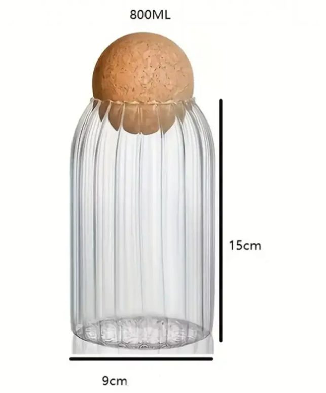 Un borcan elegant și practic, realizat din sticlă transparentă, prevăzut cu capac tip bilă din plută naturală. Ideal pentru păstrarea alimentelor uscate precum nuci, bomboane, condimente sau ceai, dar și ca obiect decorativ în bucătărie.